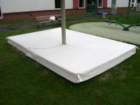 All of our Custom Sandbox Cover(s)are made here in the USA. The Custom Sandbox Cover(s) are made out of Mildew Repellant, Weight: 10oz, Not Water Repellant, and UV Stabilized for 10 years. Go to the Photos page to see the different types of Custom Sandbox Cover(s). Click on the Email US button or fill out the contact us section and one of our Experienced Sales Team Members are ready to assist you. We look forward to making you one of our Clients and go beyond your Customer Service expectations!